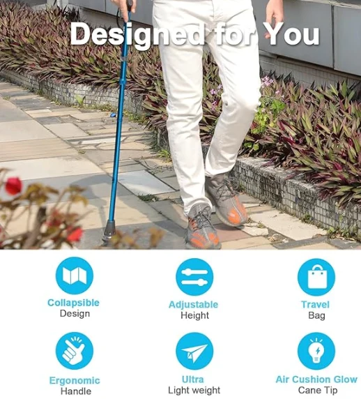 Sammenleggbar teleskopisk gangstokk, tuppen lyser seg om natten, noe som i stor grad sikrer sikkerheten for nattvandring. (Bare med eksponering i lys for en viss tid, kommer glødkjeglen til synlighet i mørket.