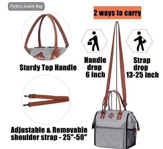 Stor lunsjpose har et hovedrom (10,5 "x6" x12 "), en stor glidelås foran (8" x7 "x1.5"), en baklomme (9,5 "x6,5") og 2 siderettlommer. Topphåndtak og justerbar og avtakbar skulderstropp (25 "-50") design for enkel bære.