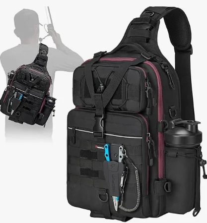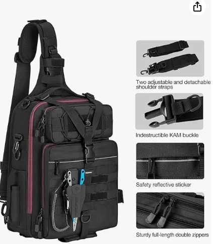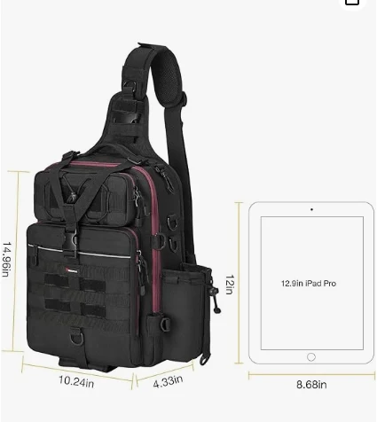 Avtakbare skulderstropper gjør det enkelt å bruke denne vesken som en slynge -skulderveske, ryggsekk, håndveske, brystpose, fiskeposepose eller reisepose. Med to stangbelter for å holde stengene dine, kan hovedstropplengden forlenges opp til 51,2 '', mens den tilknyttede stroppen kan utvides til 36,2 ''