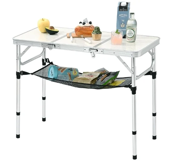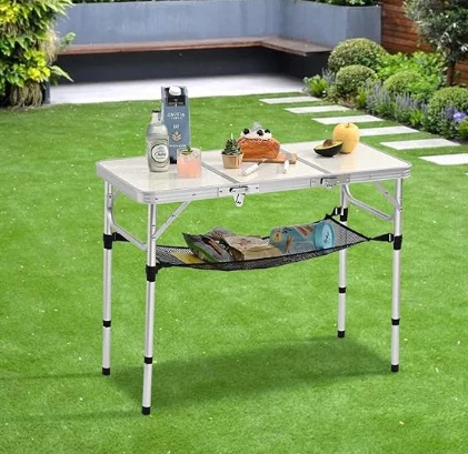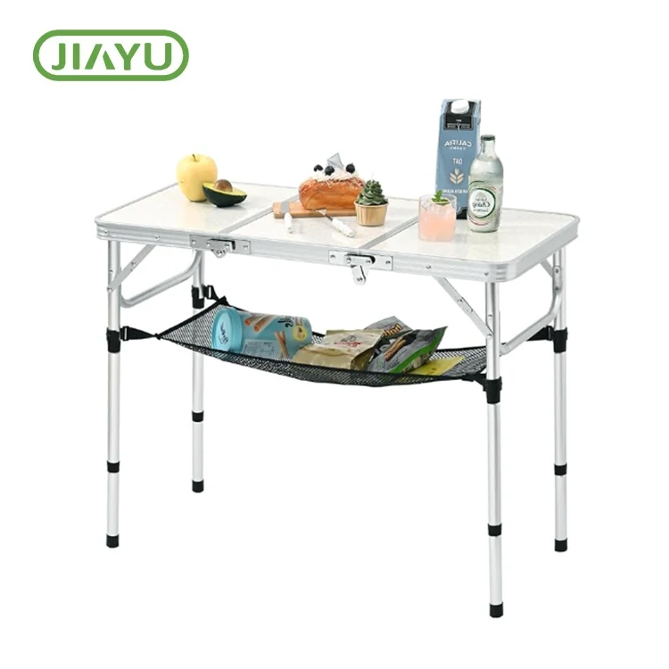 Bærbart campingbord for aluminium. Kan brukes som uteplass eller bærbar bord. Passer til servering, piknik, fiske, camping og grill. Det er allsidig nok til å dekke dine daglige behov. Zhejiang Jiayu Outdoor Products Co., Ltd., har et romslig lagringsnettlag under bordplaten for å holde det viktigste. To s-hooks for lett å henge flere ting