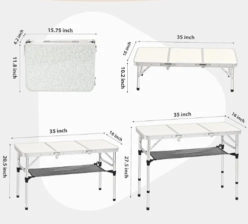 3 ft sammenleggbar bord: med dimensjoner i full størrelse på 35 tommer x16 tommer x 27,5 tommer og brettede dimensjoner på 16 tommer x 12 tommer x 4,2 tommer