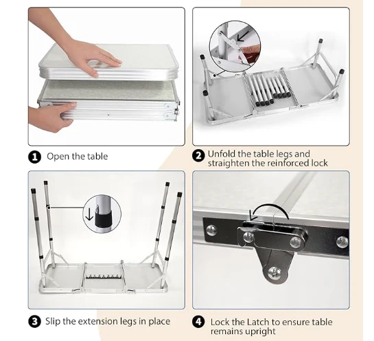 Bærbart campingbord for aluminium, lettvekt og bærbart: Det kommer med et bærehåndtak for enkel transport. Den kan brettes til en kompakt koffertstørrelse for praktisk lagring i bilen. Med vekten på 7 kg selv, kan dette bærbare bordet inneholde opptil 80 kg