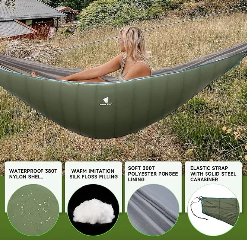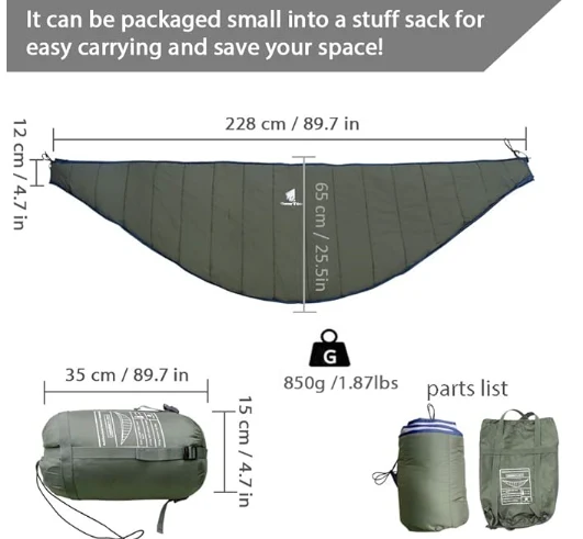 Hengock -dynen med 3 - 4 sesong er ideell for temperaturer fra 41 ° F til 68 ° F; Det er formet perfekt for å passe til å henge en hengekøye, som beskytter deg mot vinden og holder deg varmt kokonert.